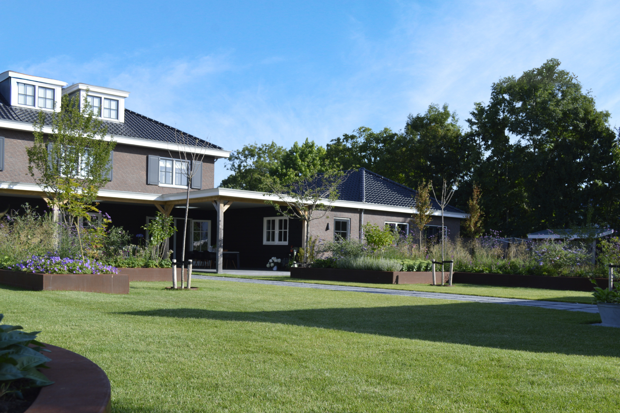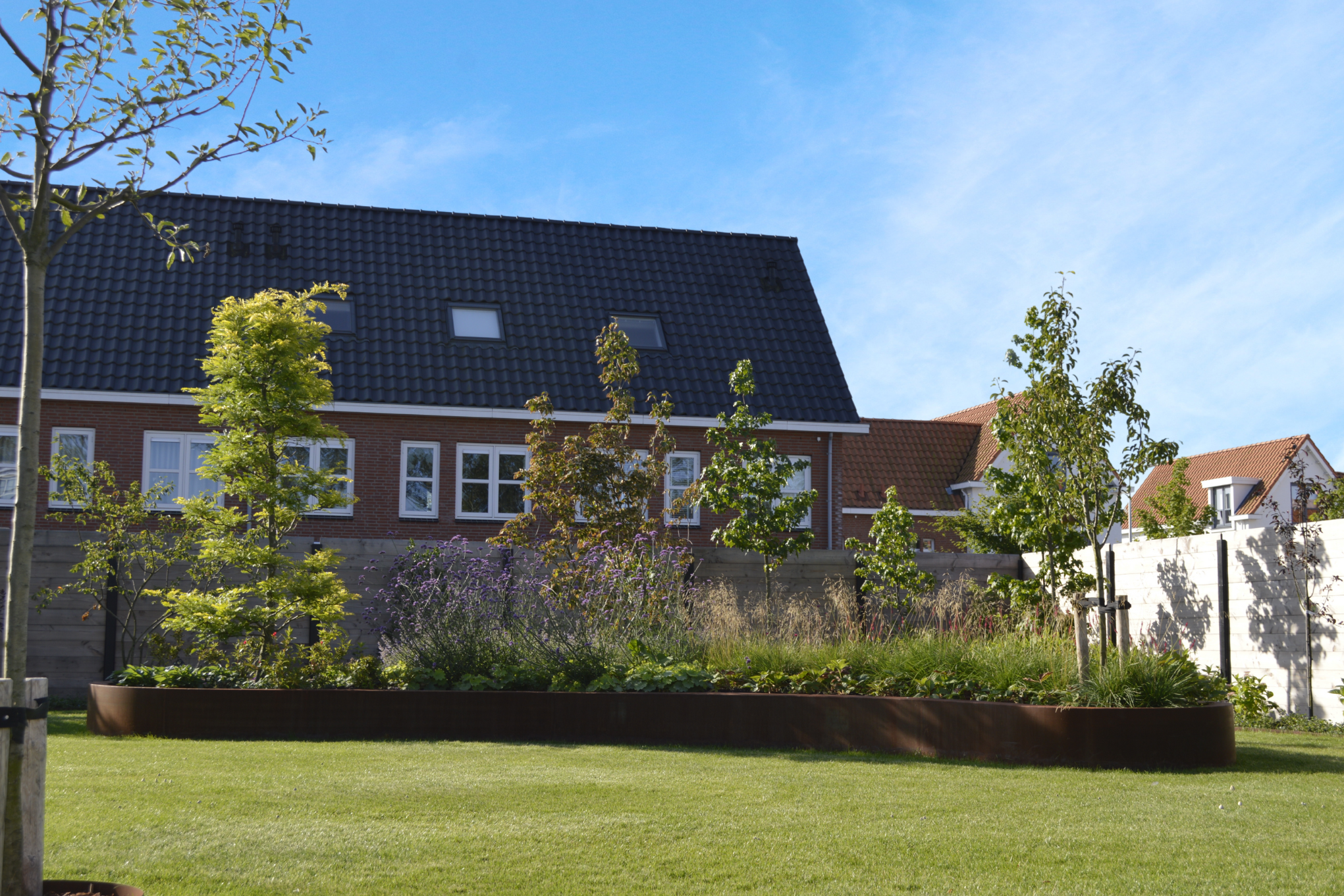 In meer natuurlijke tuinen met grind, natuursteen, olijfbomen of meerstammige bomen geeft cortenstaal juist een stoer en buitengevoel. De kleur is mat en natuurlijk, waardoor het niet overheerst maar juist zorgt voor balans in het geheel.