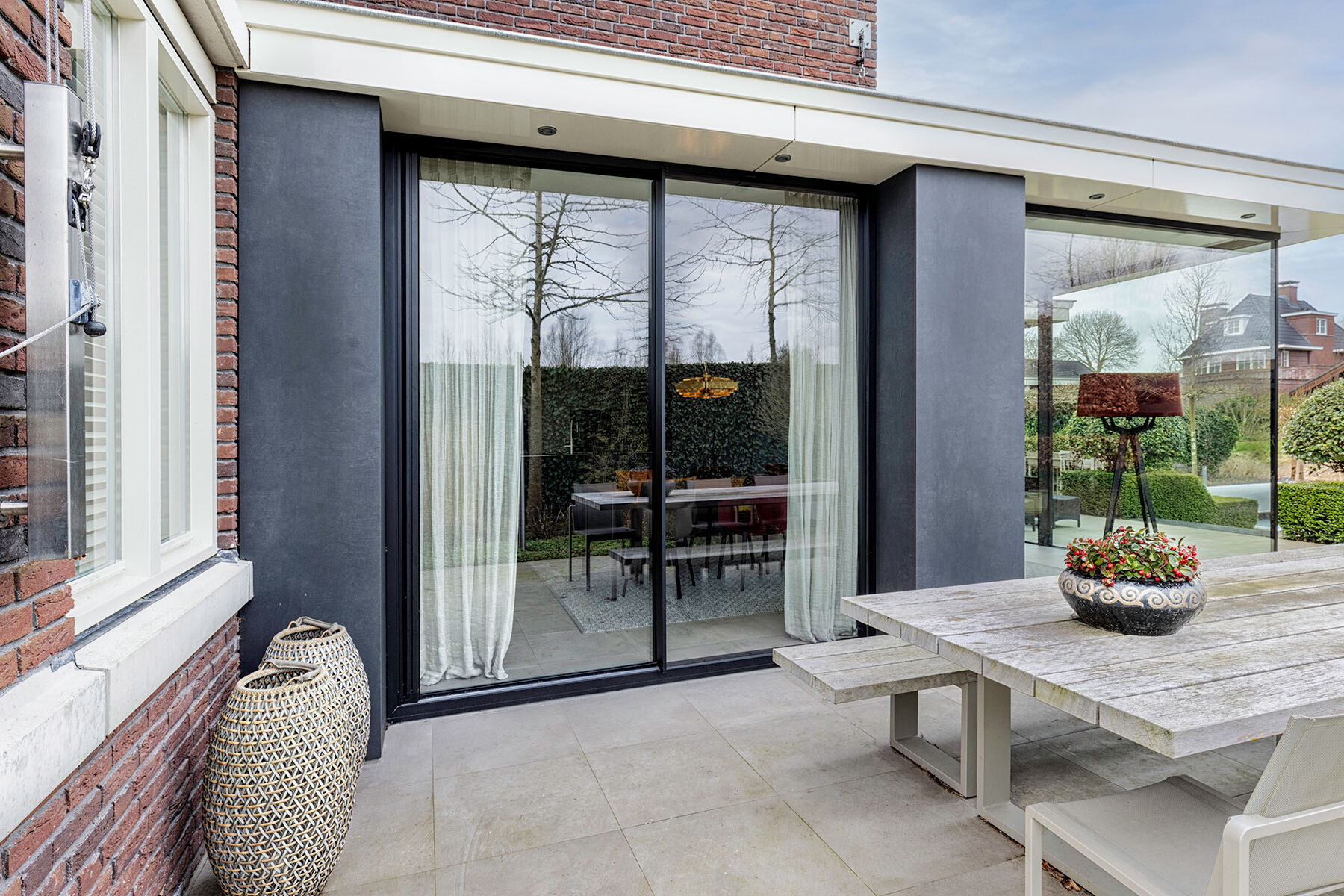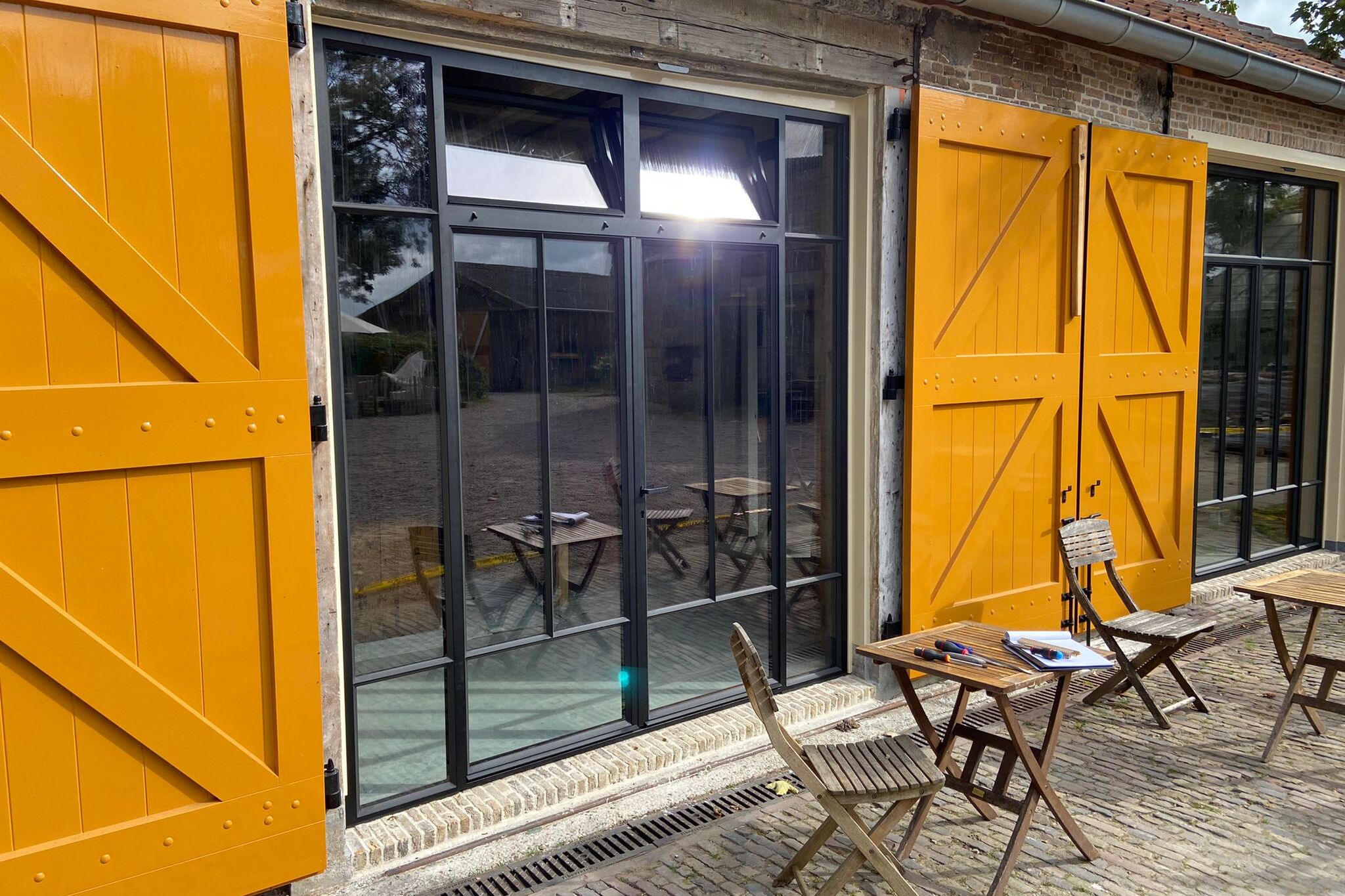 Heeft u die maximale opening niet nodig, maar wilt u profiteren van veel daglicht? Dan kunnen openslaande deuren ook worden gecombineerd met vast glas in een stalen kozijn ernaast. Zo creëert u tegen een iets gunstiger budget toch een groot glasoppervlak met een praktische doorgang.