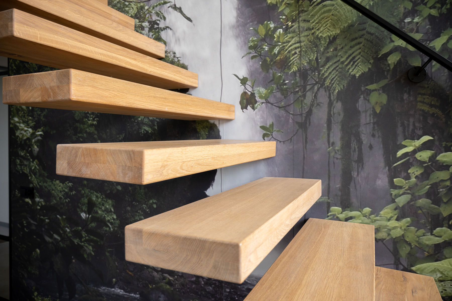 In de woning vinden we ook nog een aantal bijzondere componenten die het noemen waard zijn. In het bijzonder de zwevende trap die door een ijzersterke (of eigenlijk staalsterke) constructie in de wand wordt gedragen. De houten treden lijken zo te zweven wat een bijzondere en luxe uitstraling geeft.