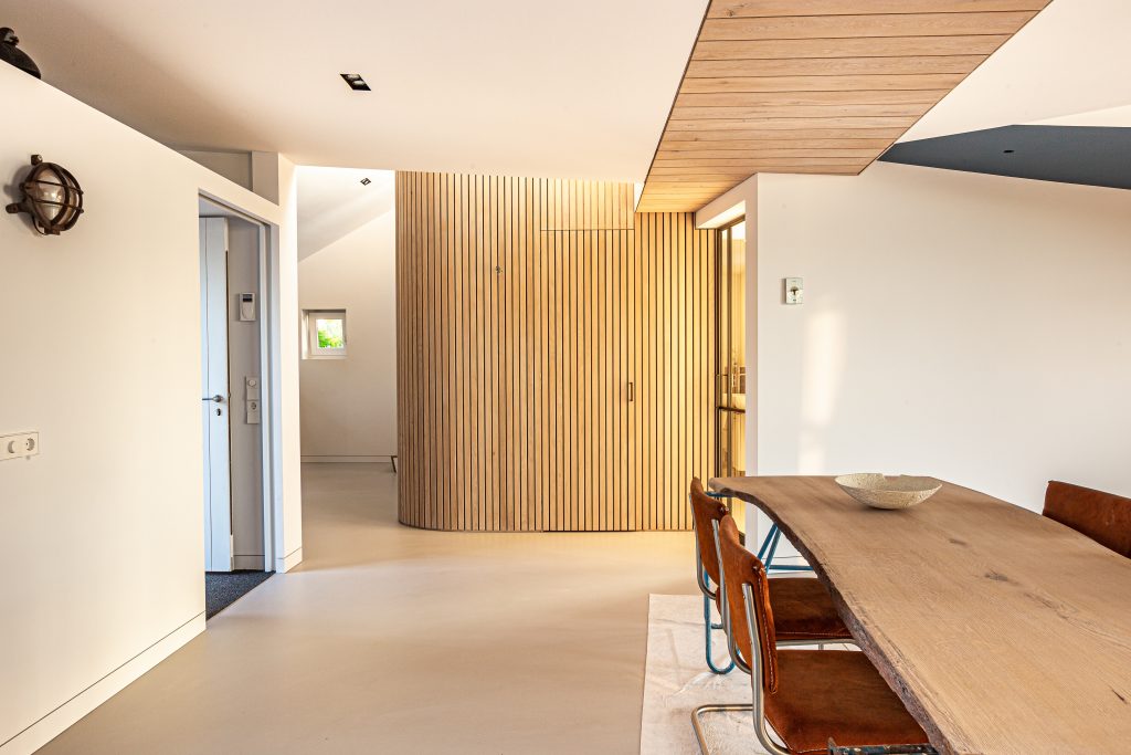 Bij het ontwerp van deze woning is rekening gehouden met de bijzondere ligging aan het meer. De architect heeft er bewust voor gekozen om het uitzicht als het ware te ‘knippen’ en te ‘framen’. Daardoor zijn er twee zijden van de woning ontstaan die beide gericht zijn op de Reeuwijkse Plassen. Ook is het water tot vlak bij de woning doorgetrokken, waardoor het huis nóg sterker in verbinding staat met het landschap. De grote glaspartijen spelen hierin een belangrijke rol: ze zorgen voor veel daglicht en maken dat binnen en buiten echt in elkaar overlopen. Door de hoge ramen, open ruimtes en het licht dat weerkaatst op het water, verandert de sfeer in huis met de seizoenen mee.
