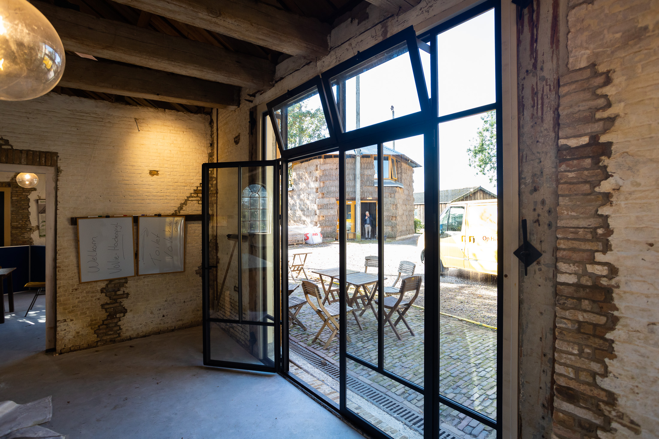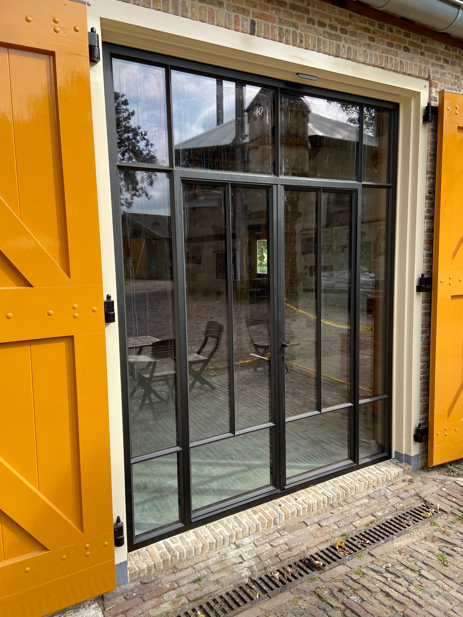 In opdracht van Verbij Bouw- en Molenmakersbedrijf B.V. realiseerden wij bij de monumentale buitenplaats Hodenpijl in Schipluiden deze naar buiten openslaande stalen deuren. De wagenschuur vormt samen met de boerderij een rijksmonument; de oudste vermelding van de boerderij dateert uit 1561. Achter de originele houten schuurdeuren plaatsten we slanke stalen kozijnen en deuren. Het historische aanzicht blijft zo volledig behouden wanneer de houten deuren gesloten zijn. Als de deuren geopend zijn valt er extra daglicht naar binnen, terwijl het dankzij de isolerende beglazing binnen lekker comfortabel blijft. De stalen profielen zijn strak en terughoudend uitgevoerd, zodat zij het metsel- en houtwerk niet overheersen. Mede door het toevoegen van deze openslaande stalen is de monumentale schuur weer helemaal aangepast aan de eisen van deze tijd, uiteraard met respect voor het karakter van deze bijzondere plek!