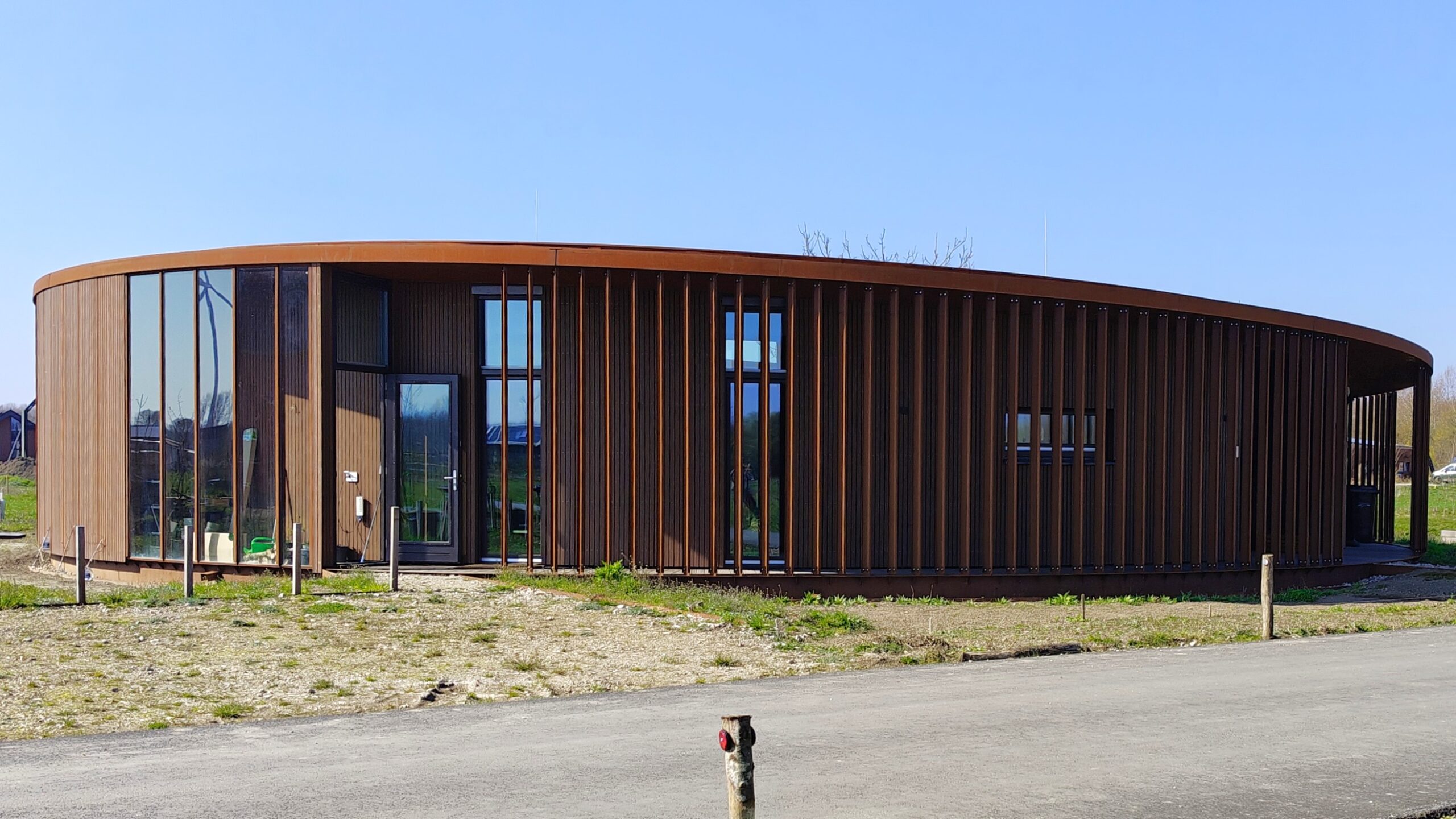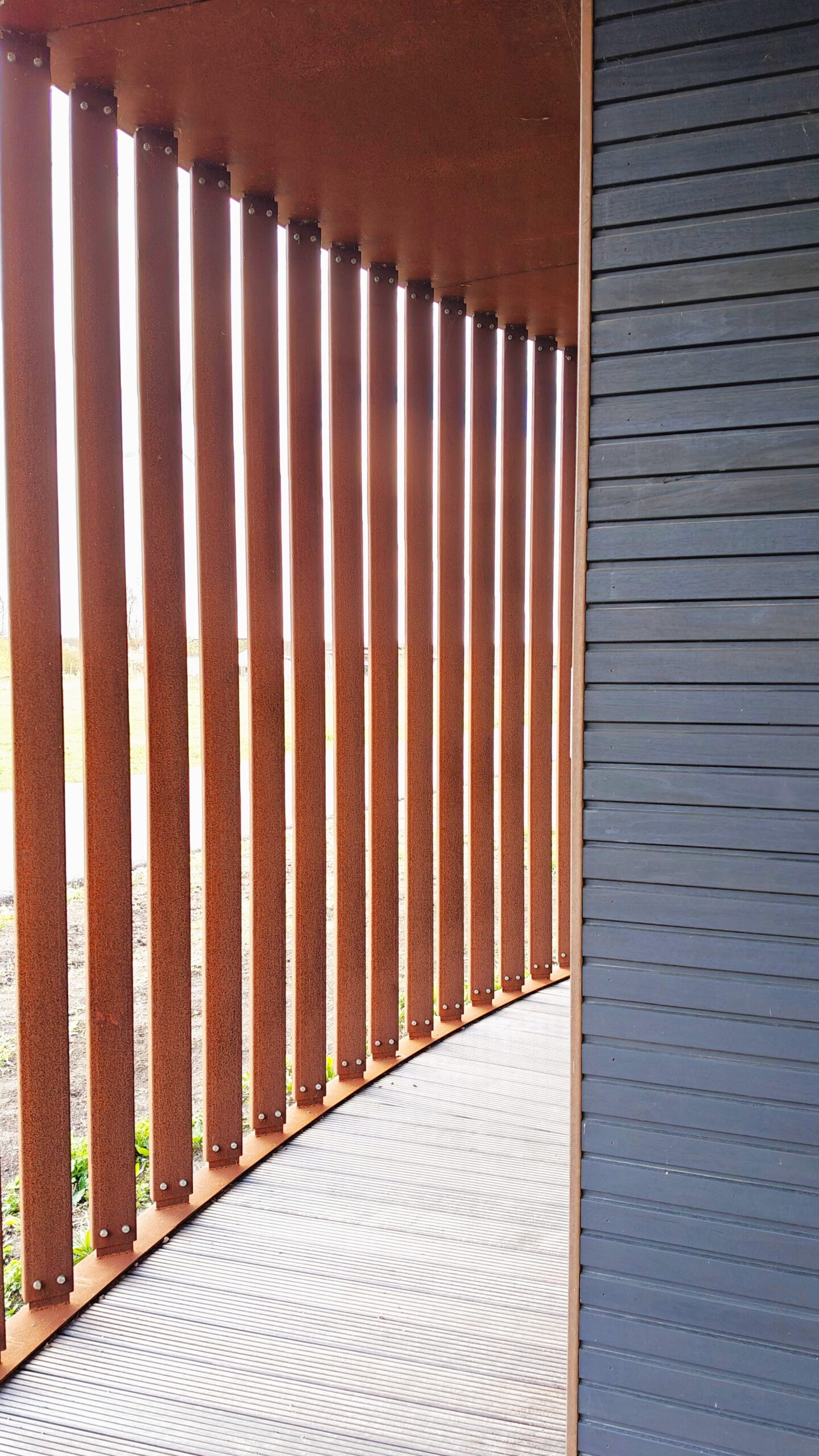 Die uitdaging zijn we samen aangegaan. De cortenstalen ring, opgebouwd uit meerdere segmenten, vormt de basis van het geheel. De schuin geplaatste lamellen geven het project karakter, beperken inkijk en zorgen voor een mooi spel van licht en schaduw.
