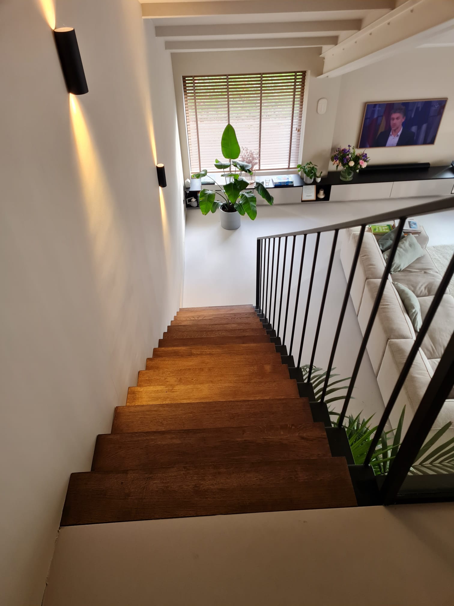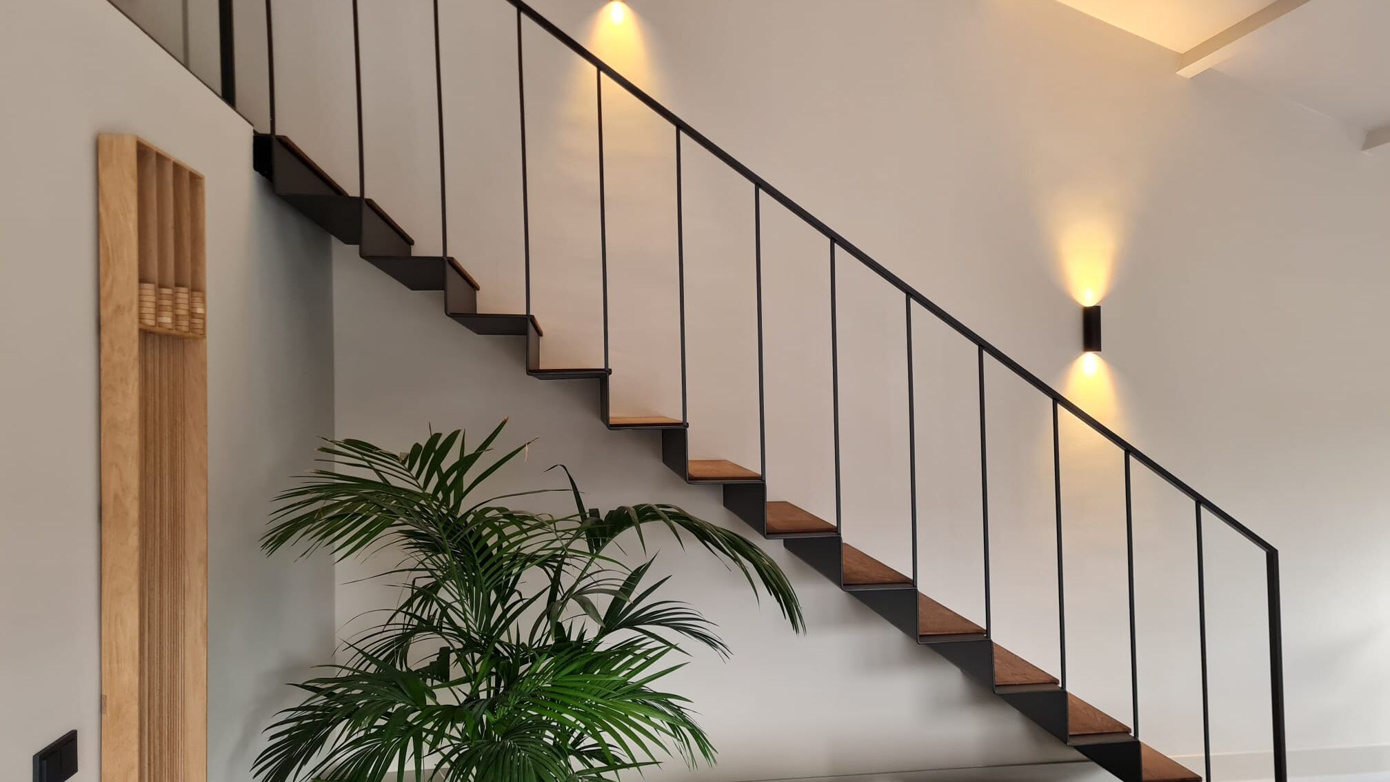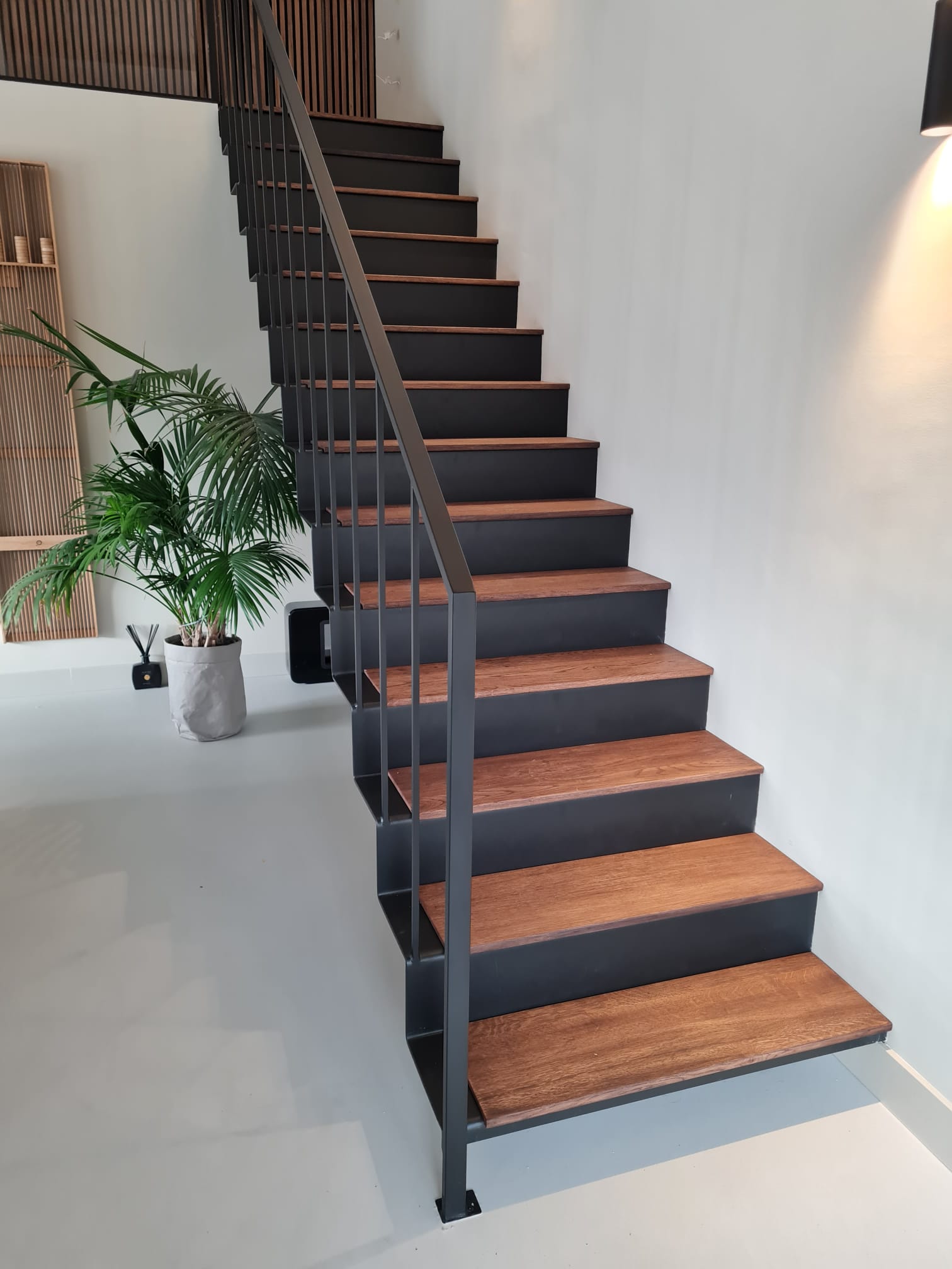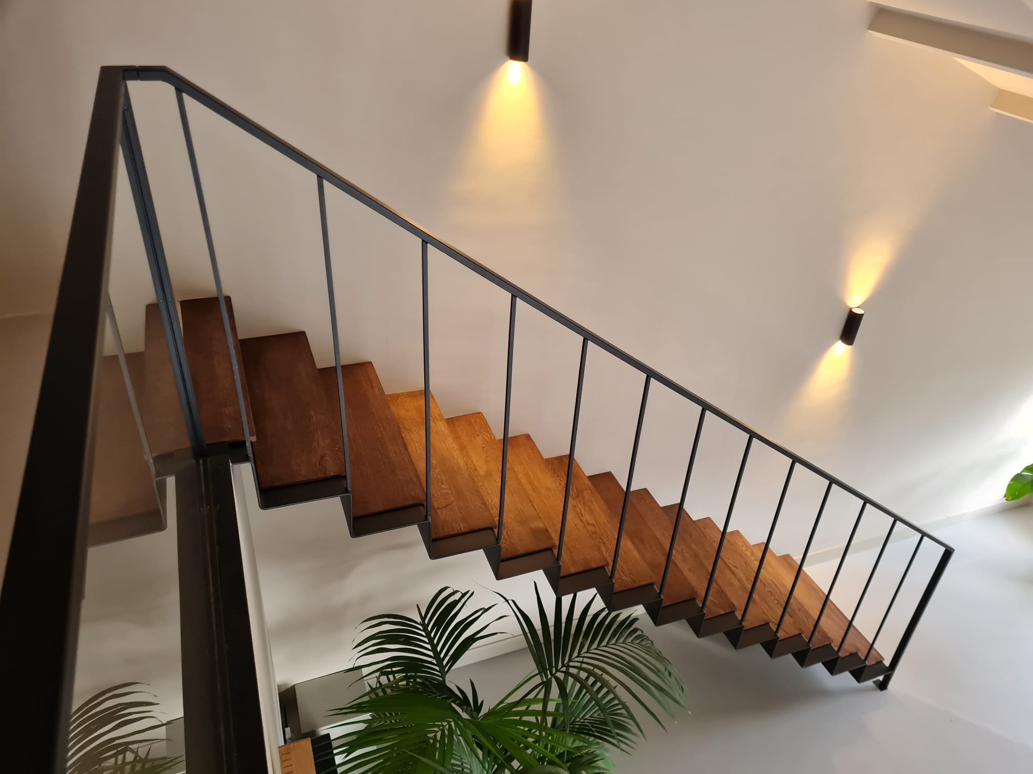 Voor een particuliere opdrachtgever in Hoogvliet realiseerden wij een unieke zwevende trap op maat met een minimalistische uitstraling. De trap is vervaardigd uit slank plaatstaal en volledig aan één zijde in de muur verankerd, waardoor een strak en ogenschijnlijk zwevend effect ontstaat. Voor de afwerking zijn de stalen treden bekleed met 10 mm massief eiken panelen, wat zorgt voor een warme look en feel.